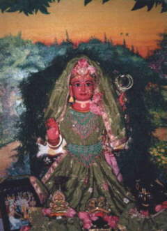 In Krishna lila she appeared as a young gopi friend of Srimati Radharani. Under the instructions of Purnamasya (Yogamaya), she would arrange secret meeting between Krishna and Radha. She would also make all the material arrangements, like saffron, fruits, flowers, music etc. for Radha Krishna. Thus she carried on her eternal service in Goloka Vrindavana in the earthly Vrindavana.
